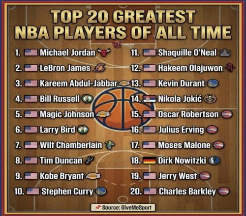 NBA历史最伟大球员TOP20发布!库里排名第10奥尼尔第11合理吗