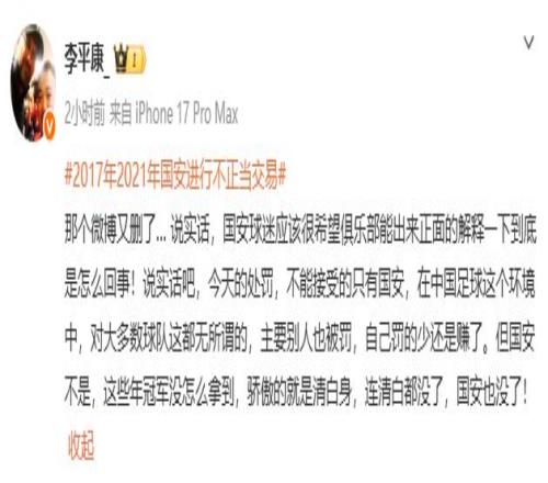 在北京国安删帖之后,李平康表示,“说实话,国安球迷应该很希望俱乐部能出来正面地解释一下到底是怎么回事!说实话吧,今天的处罚,不能接受的只有国安,在中国足球这个环境中,对大多数球队这都无所谓的,主要别人也被罚,自己罚的少还是赚了。但国安不是,这些年冠军没怎么拿到,骄傲的就是清白身,连清白都没了,国安也没了!”