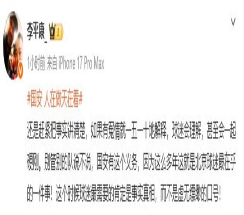 随后,李平康又表示,“还是赶紧把事实讲清楚,如果有冤情就一五一十地解释,球迷会理解,甚至会一起硬刚。别管别的队说不说,国安有这个义务,因为这么多年这就是北京球迷最在乎的一件事!这个时候球迷最需要的肯定是事实真相,而不是虚无缥缈的口号!”